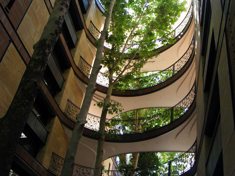 واحدهای مسکونی به صورت دایرهای بنا شده اند تا بهترین استفاده از نور و تهویه ی مطبوع صورت گیرد. راه پله های نیمه باز و منحنی، حس و حال حرکتی سیال به ساختمان می بخشند و امکان دید به محوطه را فراهم می آورند.