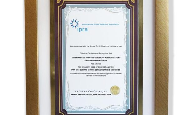 این تقدیرنامه که توسط ناتاشا پاولوویچ، رئیس انجمن بینالمللی روابط عمومی، امضا شده به دلیل توجه ویژه گروه مالی گردشگری به مسائل زیست محیطی، ترویج رفتار روابط عمومی اخلاقی و رویکرد به ارتباطات مرتبط با تغییرات آبوهوایی به مدیر روابط عمومی گروه مالی گردشگری اهدا شده است.