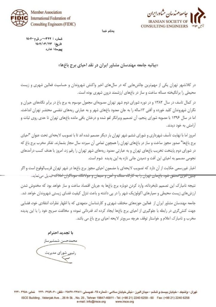 جامعه مهندسان مشاور ایران از فعالین حوزههای مختلف شهری و کارشناسان متعهدی که با اظهار نظرات انتقادی خود، فضایی جهت کنش گری برای جلوگیری از احیای برج باغها ایجاد کرده اند قدردانی نموده و مخالفت صریح خود را با این پدیده مخرب و نامبارک اعلام میکند و خواستار توقف هرچه سریعتر لایحه احیای برج باغ است.
