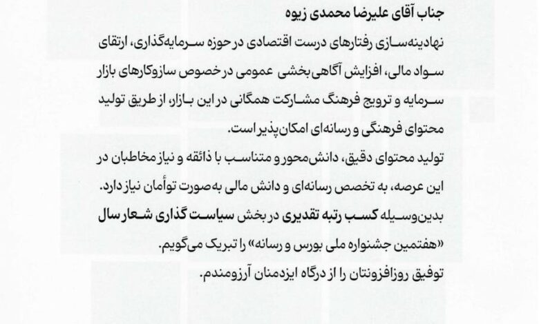 این مقاله که در بخش تبیین سیاست‌گذاری شعار سال نگارش شده؛ از سوی هیئت داوران‌ هفتمین جشنواره بورس و رسانه مورد تقدیر قرار گرفته و نگارنده از رئیس سازمان بورس و اوراق بهادار لوح تقدیر دریافت نمود.