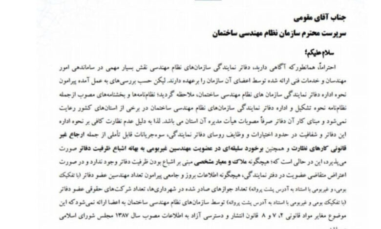 به گزارش ساختمان آنلاین بر اساس این نامه، در عمل برخی پروژههای با ارزش به افراد خاص ارجاع میشوند و همزمان برخی مهندسان به بهانه «اشباع ظرفیت»، از چرخه نظارت در برخی شهرستانها کنار گذاشته شدهاند. در متن سند آمده است که این اقدامات با اهداف اولیه سامانه برای افزایش شفافیت و حذف رانت همخوانی ندارد و نبود نظارت دقیق، زمینه را برای تصمیمهای سلیقهای و تبعیضآمیز فراهم کرده است.