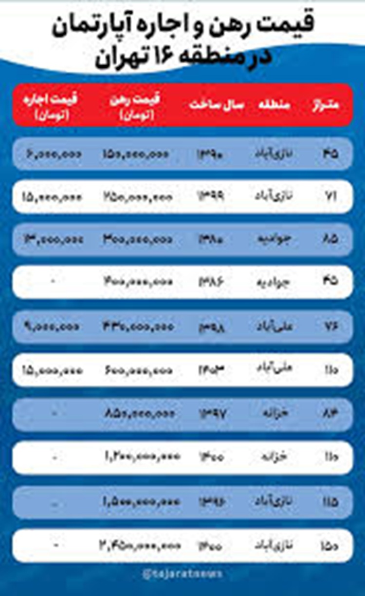 تجارت نیوز، قیمت اجاره خانه در منطقه ۱۶ تهران بسته به عواملی نظیر متراژ، سال ساخت، امکانات آپارتمان و موقعیت جغرافیایی واحد بسیار متغیر است. منطقه ۱۶ تهران در جنوب شرقی پایتخت قرار دارد و از ۶ ناحیه و ۹ محله تشکیل شده است.