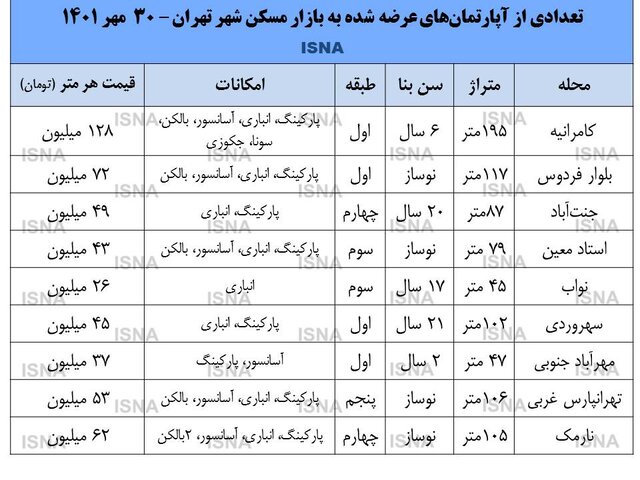 در این جدول تعدادی از آپارتمانهایی که امروز شنبه ۳۰ مهرماه ۱۴۰۱ در سایتهای فروش مسکن در شهر تهران آگهی شده آمده است.