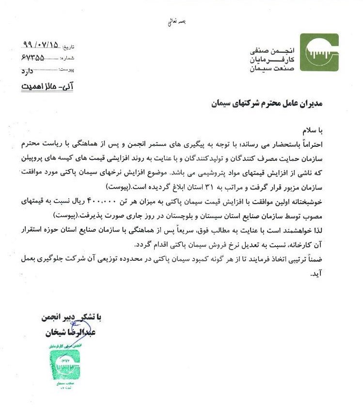 در همین زمینه دبیر انجمن صنفی کافرمایان صنعت سیمان در نامهای به مدیران عامل شرکتهای سیمانی نوشته است: «خوشبختانه اولین موافقت با افزایش قیمت سیمان پاکتی به میزان هر تن ۴۰۰ هزار ریال نسبت به قیمتهای مصوب توسط سازمان صنایع استان سیستان و بلوچستان در روز جاری صورت گرفت.»
