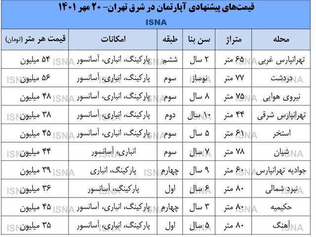 چهار منطقه مذکور به طور کلی ۲۲.۶ درصد از کل معاملات مسکن شهر تهران در شهریور ۱۴۰۱ را به خود اختصاص دادند. بررسی‌ها نشان می‌دهد بخش عمده‌ای از ساکنان مناطق شرقی تهران را اقشار متوسط تشکیل می‌دهند. عمده آپارتمان‌های این مناطق از نوع کوچک و متوسط متراژ است. با این حال حجم قابل توجهی واحد بزرگ متراژ در منطقه تهرانپارس غربی برای فروش عرضه شده که تناسب چندانی با توان خرید متقاضیان ندارد.