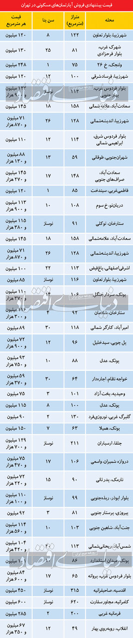جدول تازه ترین قیمت مسکن در تهران منتشر شد.