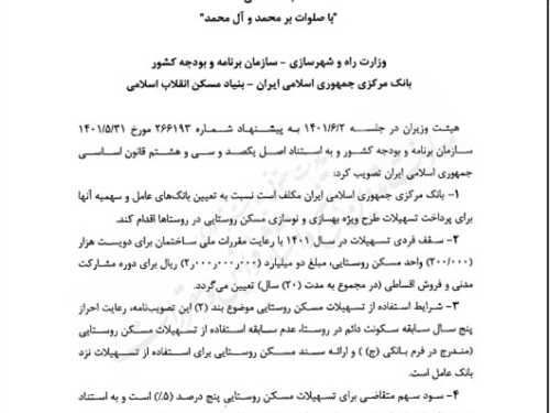 بر اساس این مصوبه، تسهیلات ساخت مسکن روستایی از ۱۰۰ به ۲۰۰ میلیون تومان با نرخ سود ۱۸ درصد، سفته زنجیره‌ای و بازپرداخت ۲۰ ساله (شامل مجموع دوره بازپرداخت و سود دوره مشارکت مدنی) افزایش می‌یابد.