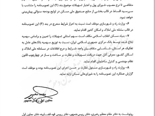 ضمن اینکه سازمان برنامه و بودجه مکلف شده ما به التفاوت این نرخ سود (۱۳ درصد) را در بودجه‌های سنواتی در قالب بخشی از هزینه‌های صندوق ملی مسکن لحاظ کند.