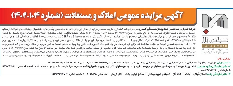 مزایده‌های جدید هلدینگ عمران و ساختمان صندوق بازنشستگی کشوری