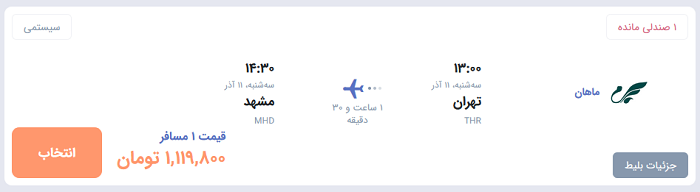 تهران – مشهد: نرخ مصوب حداکثر قیمت پرواز تهران – مشهد که در خردادماه سال جاری 701 هزار تومان بود، با افزایش 10 درصدی به 771 هزار تومان رسید. این در حالیست که امروز و با گذشت تنها دو هفته از انتشار نرخنامه جدید، شرکت هواپیمایی ماهان بلیت خود در این مسیر پروازی را یک میلیون و 119 هزار و 800 تومان، یعنی 348 هزار و 800 تومان بیش از نرخ مصوب، قیمتگذاری کرده است.
