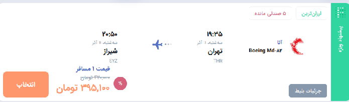 پایینترین قیمت بلیت تهران – شیراز (10 آذر 1399)