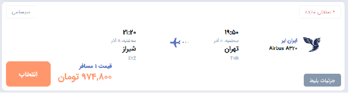 بالاترین قیمت بلیت تهران – شیراز (10 آذر 1399)