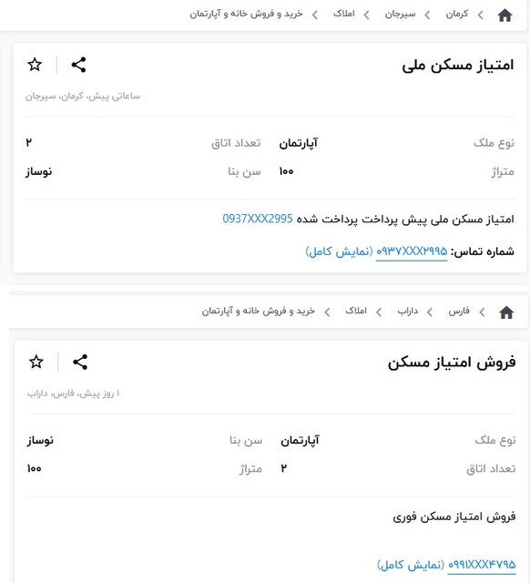 به فروشنده دیگری که یک هفته قبل فروش امتیاز مسکن ملی در شهر داراب فارس را آگهی کرده زنگ زدیم. امتیاز هنوز فروش نرفته و نرخش از قبلی کمی پایین تر است. قیمت امتیاز را ۱۵ میلیون تومان تعیین کرده و می گوید که اسمش برای مسکن ملی پشت ترمینال درآمده و باید ۴۰ میلیون تومان تا ۱۰ روز دیگر واریز کند وگرنه امتیازش از بین می رود. او هم در دفتر املاک قرارداد می نویسد اما سفته نمی دهد. می گویم وکالت محضری چی؟ می گوید قولنامه معتبر است خیالت راحت!