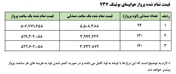 بر اساس محاسبات انجام شده، قیمت تمام شده هر ساعت-صندلی برای بویینگ ۷۳۷ به عنوان یکی از هواپیماهای باریک پیکر و با ظرفیت ۱۴۰ مسافر که با شرایط پروازهای داخلی ایران مبنی بر کم بودن فاصله فرودگاهها منطبق بوده و جزو هواپیماهای کم هزینه محسوب میشود، با لود پروازی ۹۰ مسافر، ۵۵۰ هزار تومان و برای هر یک ساعت پرواز، ۵۰ میلیون تومان برای ایرلاینها هزینه دارد.