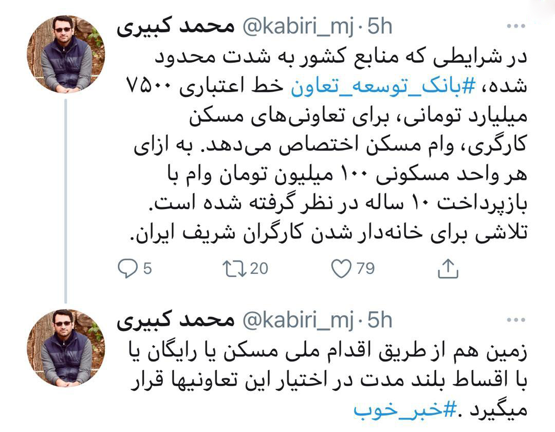 در شرایطی که منابع کشور به شدت محدود شده، ⁧‫بانک توسعه تعاون‬⁩ خط اعتباری ۷۵۰۰ میلیارد تومانی، برای تعاونی‌های مسکن کارگری، وام مسکن اختصاص می‌دهد. به ازای هر واحد مسکونی ۱۰۰ میلیون تومان وام با بازپرداخت ۱۰ ساله در نظر گرفته شده است. تلاشی برای خانه‌دار شدن کارگران شریف ایران.